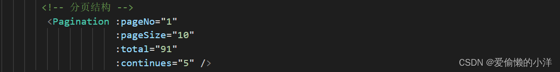 首先,在使用分页器的父组件中给子组件传递4个参数:①pageNo(当前是第几页)②pageSize(每页展示的数据条数)③total(总的数据量)④continues(分页连续页码个数,一般为奇数:5|7)