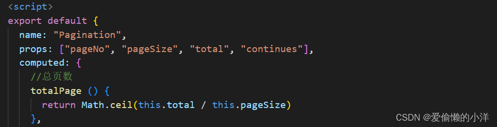 子组件利用props接收父组件传递过来的参数,并且利用计算属性computed计算出分页器的总页数(totalPage);此处计算出来的数据记得要向上取整(Math.ceil())