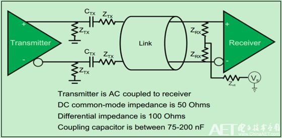 由于其速度很高,因此采用的是交流耦合的方式(AC-Coupled),说白了就是在信号线上加了电容Ctx,此时低频信号和直流信号都会被抑制。