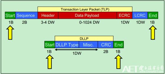 注:这里所说的TLP和DLLP指的是包的原始发送者发的包,即TLP表示这个包的原始发送者为事务层,而DLLP则为数据链路层。但是TLP仍然会被数据链路层转发,并添加Sequence和LCRC。