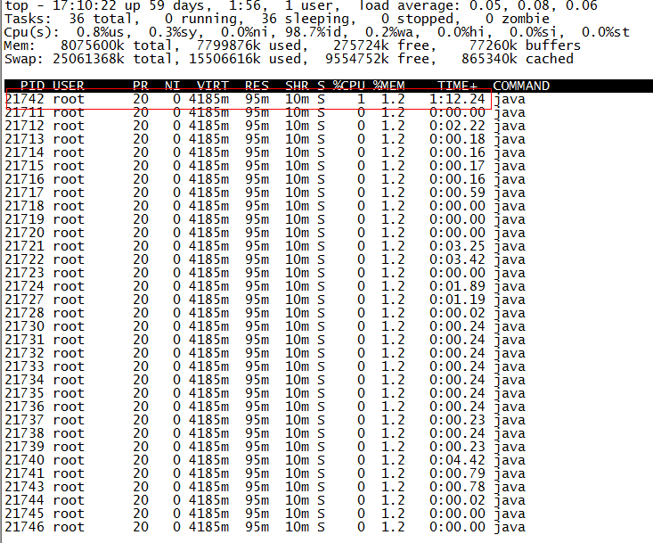 TIME列就是各个Java线程耗费的CPU时间,CPU时间最长的是线程ID为21742的线程,用