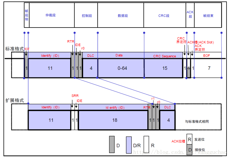 其中 RTR 位用于标识是否是远程帧(0,数据帧; 1,远程帧), IDE 位为标识符选择位(0,使用标准标识符; 1,使用扩展标识符), SRR 位为代替远程请求位,为隐性位,它代替了标准帧中的 RTR 位。