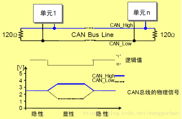 从该特性可以看出,显性电平对应逻辑 0, CAN_H 和 CAN_L 之差为 2.5V 左右。而隐性电平对应逻辑 1, CAN_H 和 CAN_L 之差为 0V。在总线上显性电平具有优先权,只要有一个单元输出显性电平,总线上即为显性电平。而隐形电平则具有包容的意味,只有所有的单元都输出隐性电平,总线上才为隐性电平(显性电平比隐性电平更强)。另外,在 CAN 总线的起止端都有一个 120Ω的终端电阻,来做阻抗匹配,以减少回波反射。