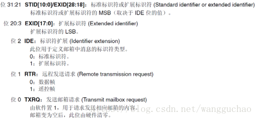 第三个,我们介绍 CAN 发送邮箱标识符寄存器(CAN_TIxR)(x=0~3),该寄存器各位描述如图所示: