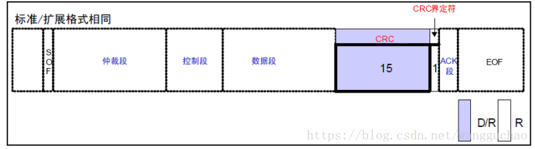 CRC 段,该段用于检查帧传输错误。由 15 个位的 CRC 顺序和 1 个位的 CRC 界定符(用于分隔的位)组成,标准帧和扩展帧在这个段的格式也是相同的。如图所示: