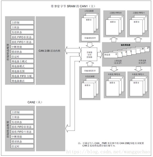 从图中可以看出两个 CAN 都分别拥有自己的发送邮箱和接收 FIFO,但是他们共用 28 个滤波器。通过 CAN_FMR 寄存器的设置,可以设置滤波器的分配方式。