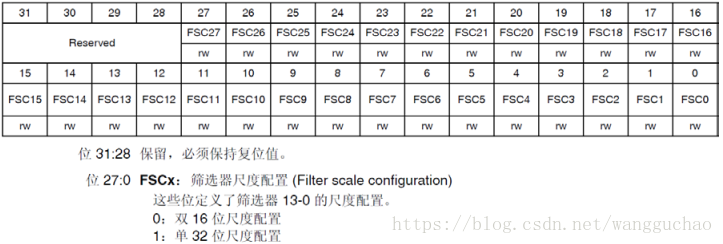该寄存器用于设置各滤波器组的位宽,对 28 个滤波器组的位宽设置,都可以通过该寄存器实现。该寄存器也只能在过滤器处于初始化模式下进行设置。
