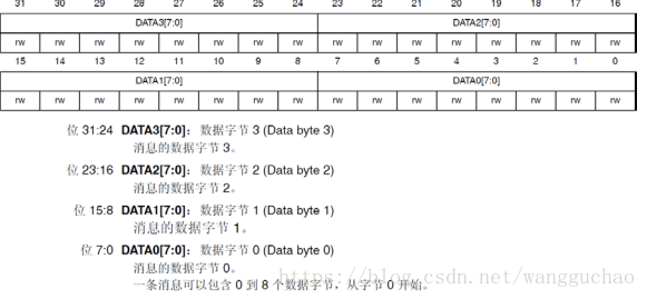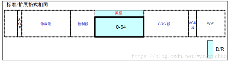 数据段,该段可包含 0~8 个字节的数据。从最高位(MSB)开始输出,标准帧和扩展帧在这个段的定义都是一样的。如图 所示: