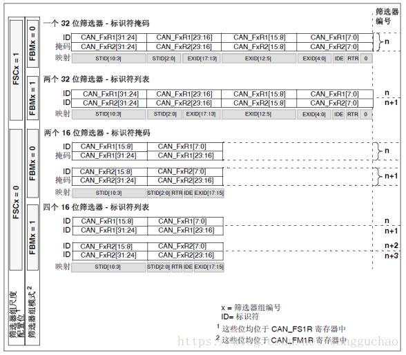 过滤器组中的每个过滤器,都被编号为(叫做过滤器号,图 中的 n)从 0 开始,到某个最大数值-取决于过滤器组的模式和位宽的设置。