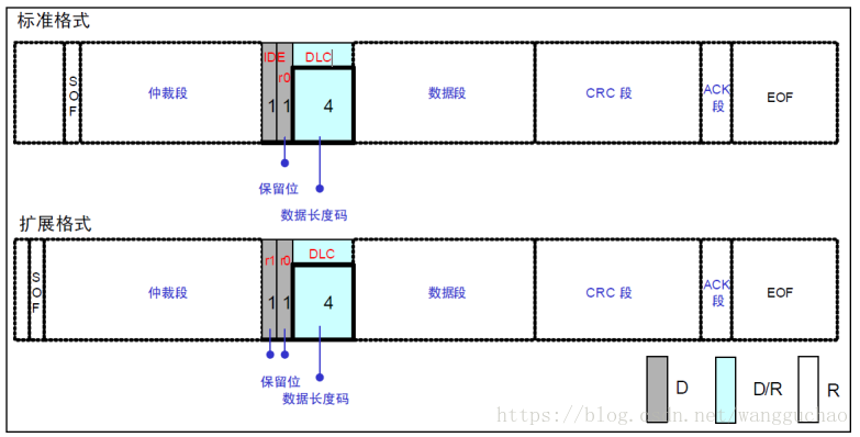仲裁段,表示数据优先级的段,标准帧和扩展帧格式在本段有所区别,如图 所示: