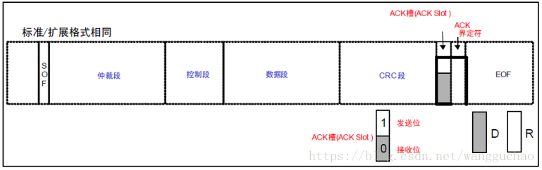 ACK 段,此段用来确认是否正常接收。由 ACK 槽(ACK Slot)和 ACK 界定符 2 个位组成。标准帧和扩展帧在这个段的格式也是相同的。如图所示: