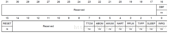 图中还给出了 CAN 波特率的计算公式,我们只需要知道 BS1 和 BS2 的设置,以及 APB1的时钟频率(一般为 45Mhz),就可以方便的计算出波特率。比如设置 TS1=9、TS2=5 和 BRP=6,在 APB1 频率为 45Mhz 的条件下,即可得到 CAN 通信的波特率=45000/[(5+9+1)*6]=500Kbps。接下来,我们介绍一下本章需要用到的一些比较重要的寄存器。首先,来看 CAN 的主控制寄存器(CAN_MCR),该寄存器各位描述如图: