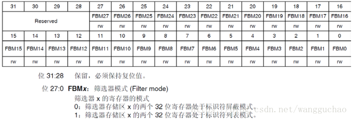 该寄存器用于设置各滤波器组的工作模式,对 28 个滤波器组的工作模式,都可以通过该寄存器设置,不过该寄存器必须在过滤器处于初始化模式下(CAN_FMR 的 FINIT 位=1),才可以进行设置。