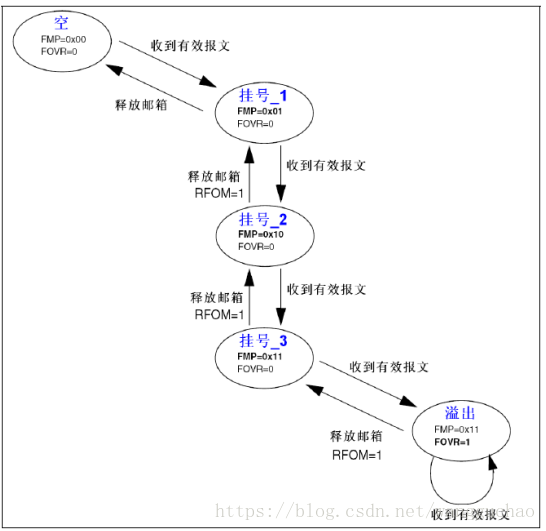 CAN 接收流程为: FIFO 空------>收到有效报文---->挂号_1(存入 FIFO 的一个邮箱,这个由硬件控制,我们不需要理会) ---->收到有效报文------>挂号_2----->收到有效报文----->挂号_3------->收到有效报文------>溢出。