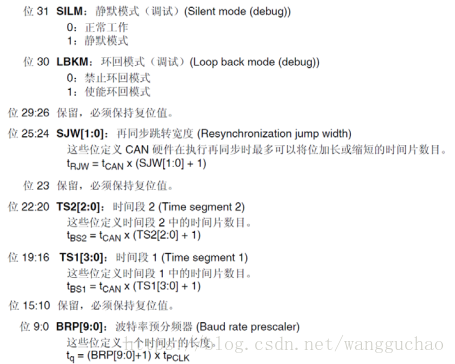 第二个,我们介绍 CAN 位时序寄存器(CAN_BTR),该寄存器用于设置分频、 Tbs1、 Tbs2以及 Tsjw 等非常重要的参数,直接决定了 CAN 的波特率。另外该寄存器还可以设置 CAN 的工作模式,该寄存器各位描述如图所示: