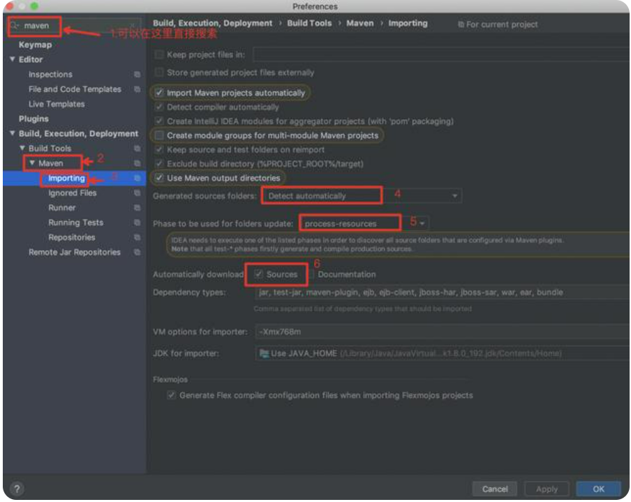 如果方案一尝试后仍然无法解决该问题,别慌,有可能是你的项目依赖有更新,而你的jdea没有开启自动加载更新后的依赖,也可能导致该问题的产生。开启自动加载JAR包的设置路径为:Intllij IDEA—>Preferences—>Build,Execution,Deployment—>Maven—>Importing,具体设置如下图: