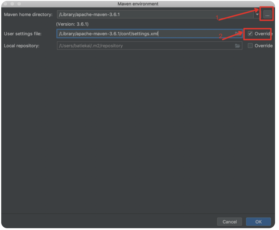 其中第1点击选择你的maven安装位置,第2是选择你的maven配置文件路径然后点击【OK】即可进行导入。