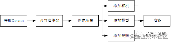 Three.js将WebGL底层的图形接口进行封装,这样就无需掌握复杂的图形学和复杂的数学知识,提高开发效率,本次就漂亮的玫瑰就是利用Three.js实现整。为了利用Three.js将模型展示在浏览器中,需要结合渲染器、场景、相机、模型和光照等。Three.js创建流程如图所示,其创建流程包括以下几个步骤: