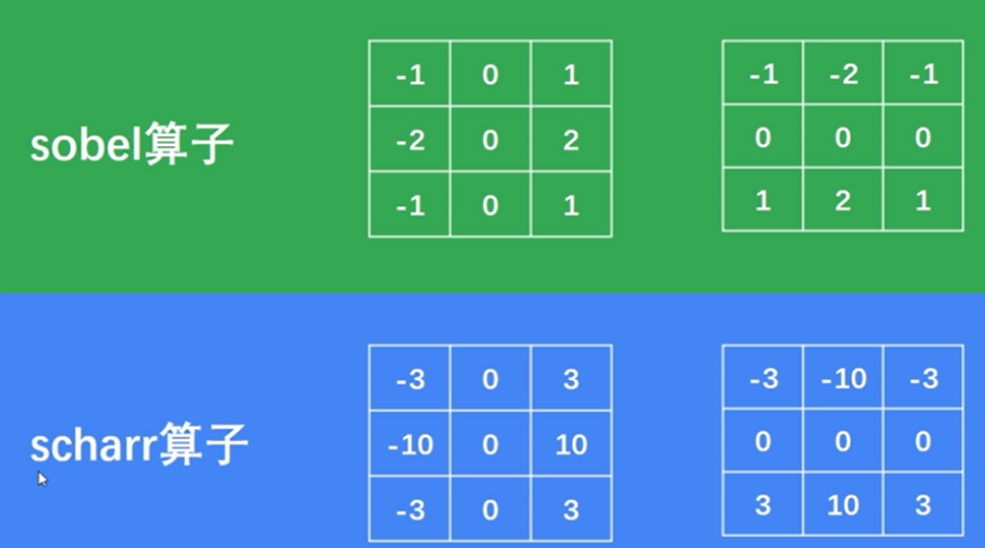 左边算子反映垂直方向的边缘,右边算子反映水平方向的边缘。由于Scharr算子比Sobel算子的数值要大,因此对于灰度变化较为敏感,会得到较强的边缘强度,不过细节就会不太好。