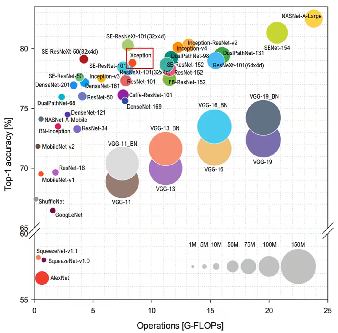 Xception 是一种兼顾了准确性和轻量化的算法。如下图所示,横轴表示计算量,纵轴表示准确率。在准确率上,Xception是排在第一梯队的,且在计算速度上,也算是轻量化网络模型。