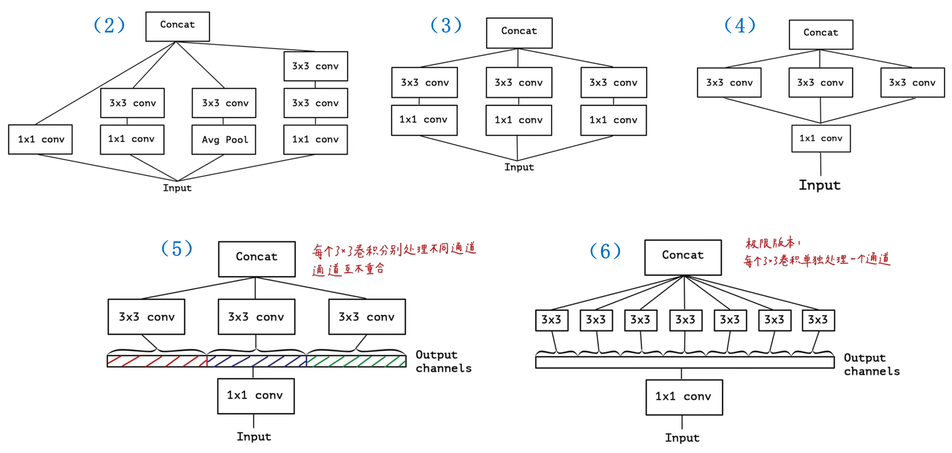 接下来梳理一下从Inception到Xception网络的核心模块的改进过程,帮助大家对Xception结构有进一步的认识。