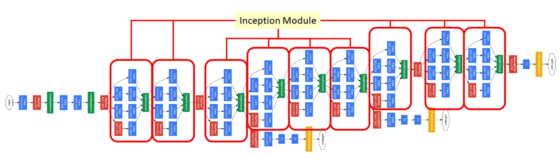 首先 InceptionV1 是由9个 BottleNeck-Inception 模块堆叠而成,如下图所示。