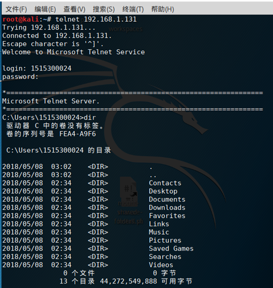 使用Wireshark的流追踪功能还原出本次明文传输的Telnet通信过程,可以看出这些信息和客户端上的过程基本一致