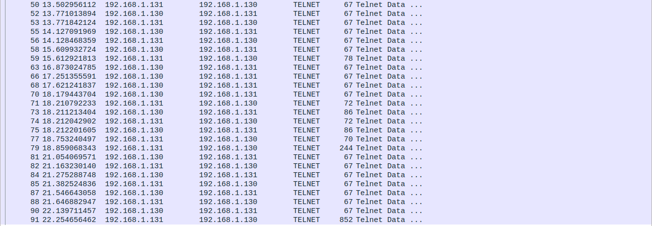 下图为客户端Wireshark抓取的Telnet流量包截图截图: