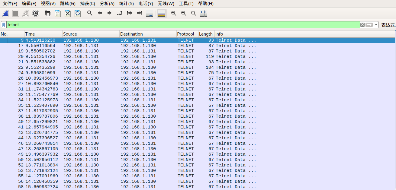 从客户端命令行上输入 telnet IP 地址,之后输入帐号/口令字,登入 Telnet 服务器。同时在客户端开启Wireshark抓包工具,抓取客户端 192.168.1.130 登录到Telnet 服务器192.168.1.131 的数据包