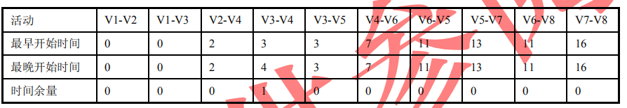 最后,时间余量(活动的最早开始时间=最晚开始时间)为0的活动即关键路径,即把V3-V4边删去后的三条路径都是关键路径。