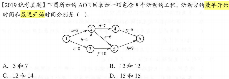 【解析】活动d的最早开始时间=该活动弧的起点所表示的事件(事件2)的最早发生时间=max{a,b+c}=max{3,12}=12。