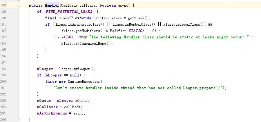 这个方法在198行获取了一个mLooper,然后又取了mLooper中的mQueue作为Handler的成员变量,就结束了。