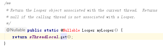 这里就涉及到ThreadLocal的知识(ThreadLocal在多线程开发的过程中有着至关重要的作用,强烈建议同学们去了解一下),为了方便我们可以粗暴的把这个理解成为线程安全的HashMap,可以根据执行这个方法的线程获取出对应的对象。这里的话get的就是Looper,这也从侧面证明了一点:一个线程对应一个Looper。