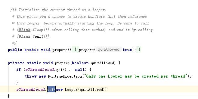 这里我们set进去一个新创建的Looper(同时我们的也可以看到MessageQueue也是在这里进行初始化创建的)