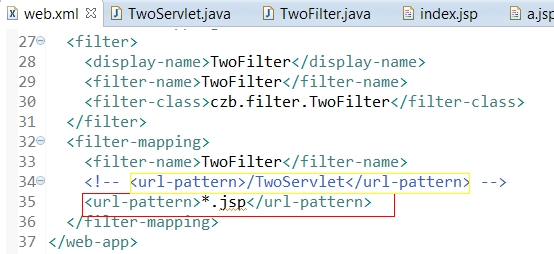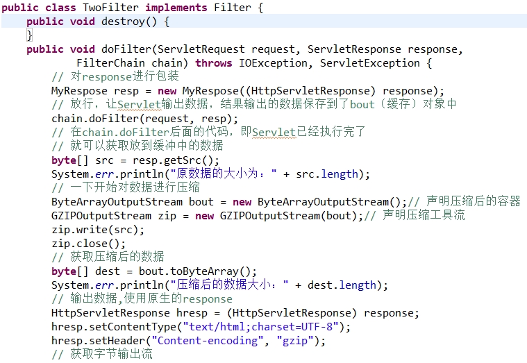第二步:开发一个过滤器,拦截TwoServlet(包装response,重写getwriter方法)