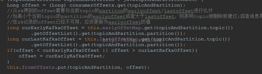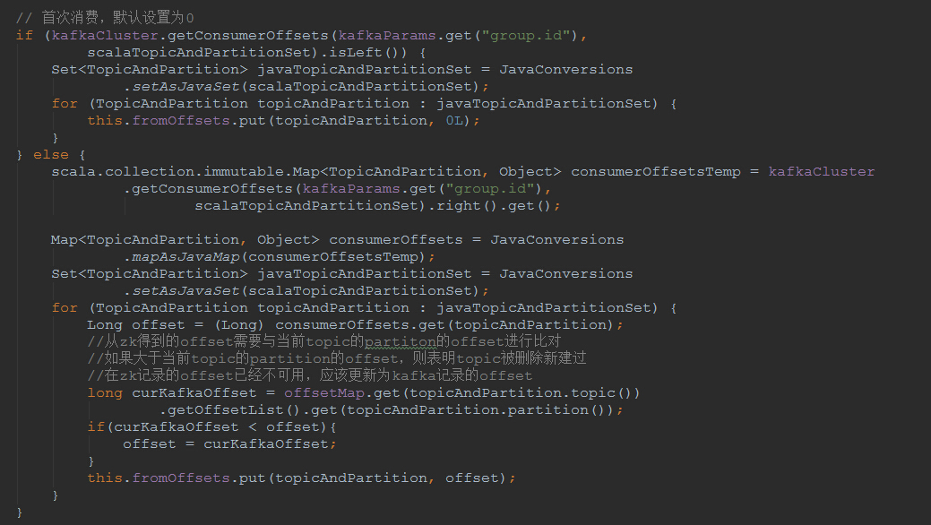 3.再在KafkaCluster从zk中得到offset信息时,与从broker得到的offset信息中比对(假定调用KafkaUtil的getKafkaOffsetByTopicList得到的返回值放在了offsetMap中):