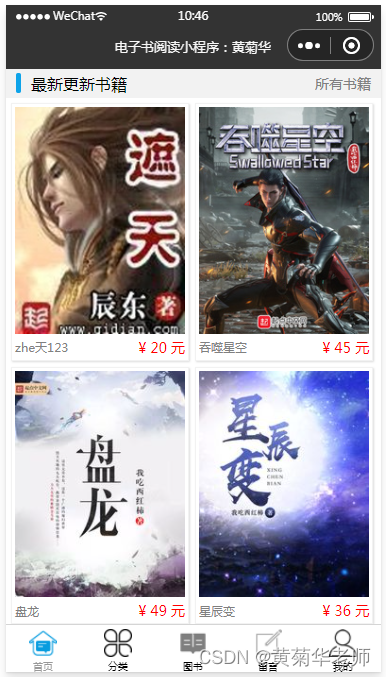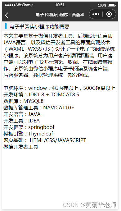 以上就是炙热春天最近收集整理的关于基于Java后台(Springboot框架)+前端小程序(MINA框架)+Mysql数据库的在线电子书阅读小程序系统设计与实现项目背景和意义可行性分析主要功能模块开发概要开发文件说明成品效果图的全部内容,更多相关基于Java后台(Springboot框架)+前端小程序(MINA框架)+Mysql数据库内容请搜索靠谱客的其他文章。