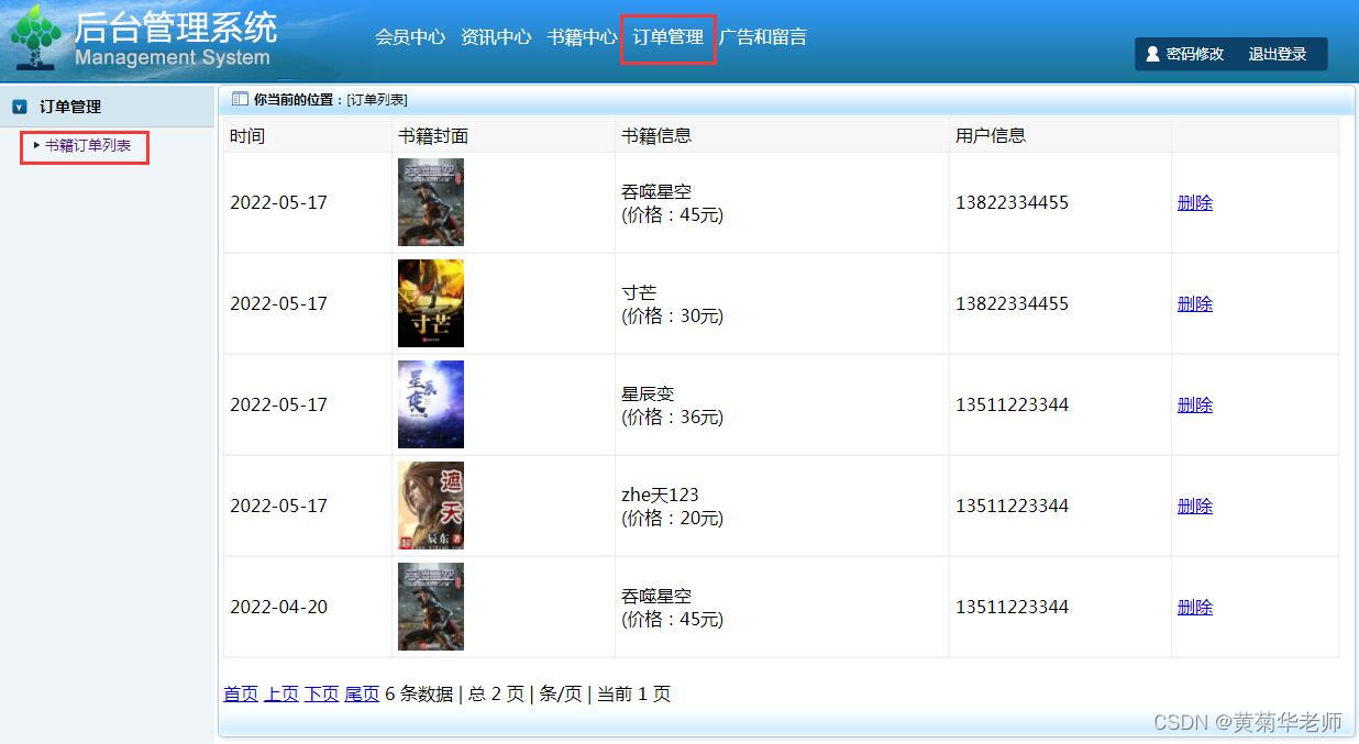 电子书订单管理:查看所有下单的信息,支持删除