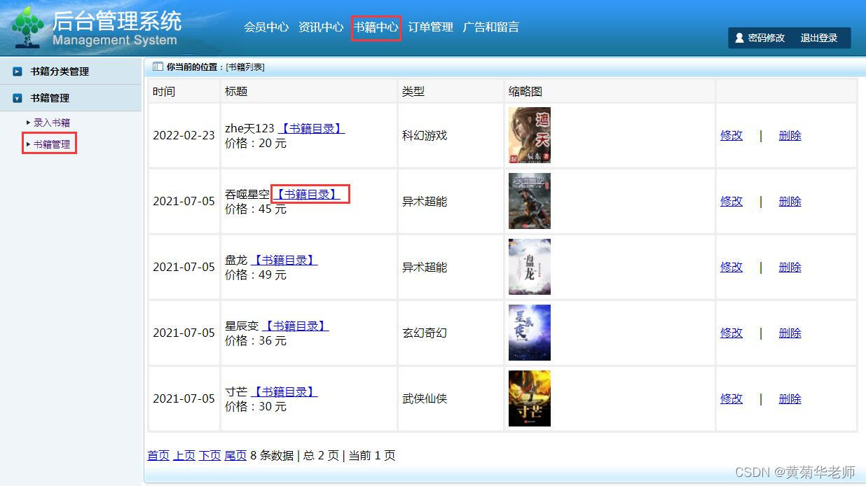 电子书管理:显示所有录入的电子书信息,支持修改和删除