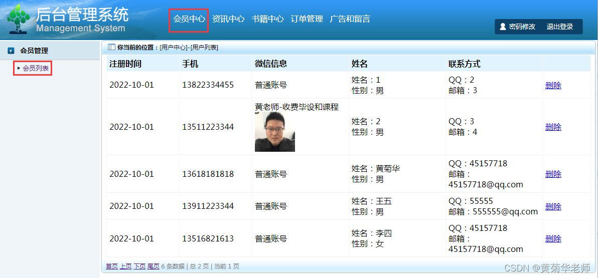 会员列表:查看所有注册会员信息,支持删除