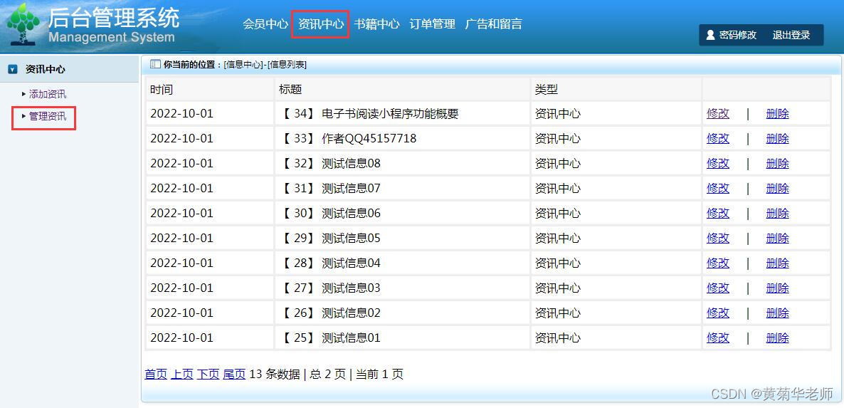 管理资讯:查看已录入资讯列表,支持删除和修改