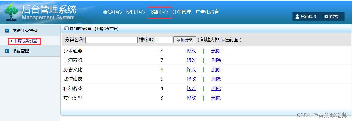 电子书分类管理:录入电子书分类,查看现有分类,修改和删除分类