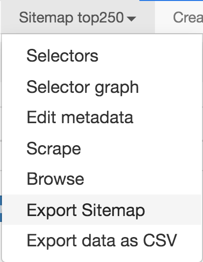 导出 Sitemap 很简单,比如说我们创建的 top250 Sitemap,点击 Sitemap top250,在下拉菜单里选择 Export Sitemap,就会跳到一个新的面板。