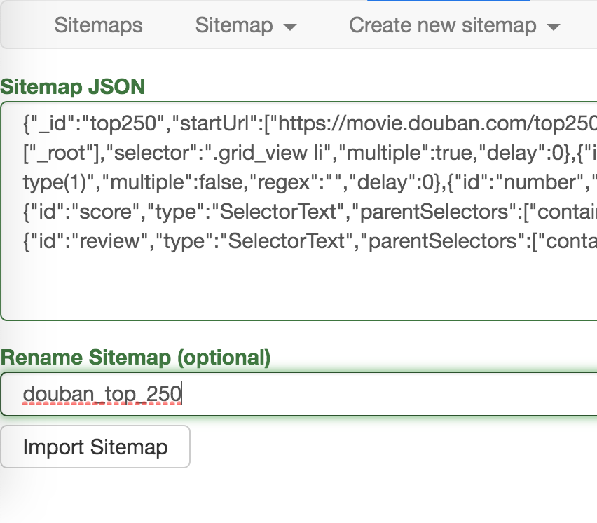 在新的面板里,在 Sitemap JSON 里把我们导出的文字复制进去,Rename Sitemap 里取个名字,最后点击 Import Sitemap 按钮就可以了。
