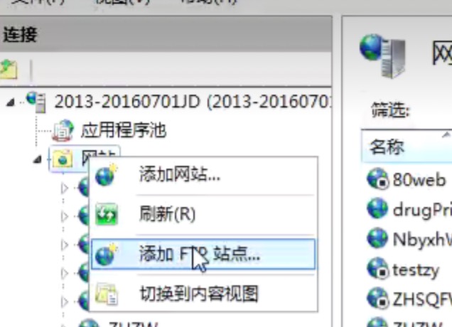 2.4 IIS网站管理器界面左边导航栏找到“网站”,右键弹出菜单,点击添加FTP站点