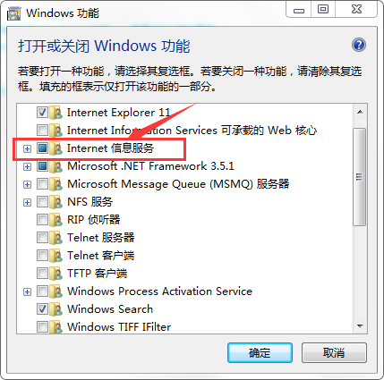 1.4 从“启用或关闭Windows功能”弹窗中找到Internet Information Services(或者中文版Internet信息服务)并打开