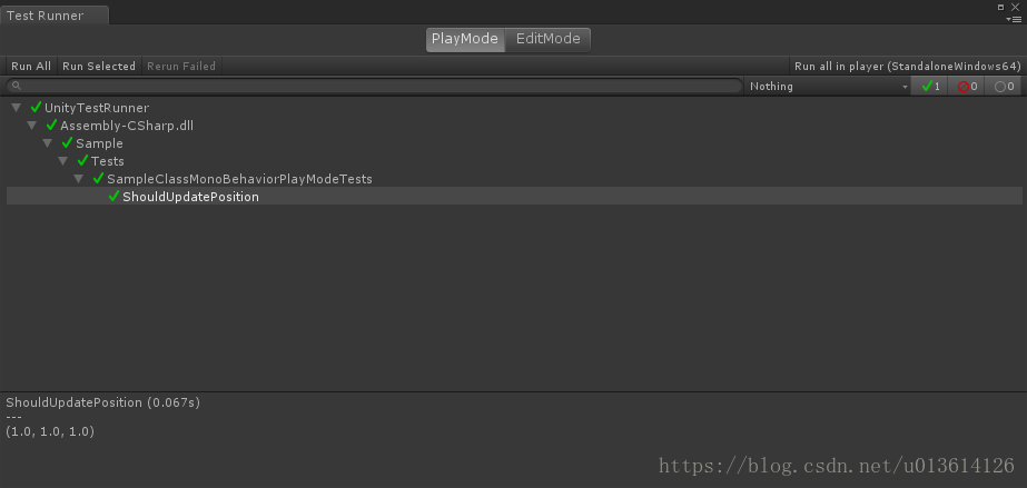 Enable play mode tests for all assemblies,然后按提示重启编辑器。然后在 Test Runner 中点击PlayMode标签页,运行结果如下: