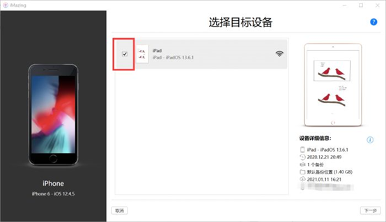 迁移数据的可选对象是iMazing已连接的设备,小编要将数据从iPhone迁移到iPad中,迁移对象勾选“iPad”。