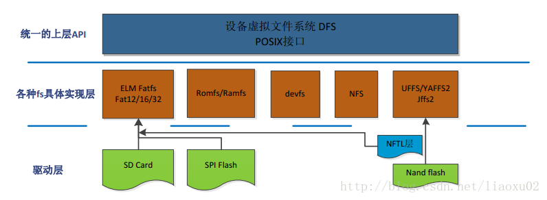 1. 最顶层的是一套面向嵌入式系统专门优化过的虚拟文件系统(接口)。这层为我们提供了访问文件的各种API:open、close、read、write等等