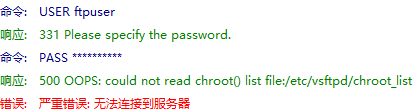 这种情况是说明配置文件里面设置的chroot_list_file=/etc/vsftpd/chroot_list没找到这个文件